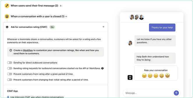 FIN AI automatically handles FAQs, while custom workflows route conversations, send targeted messages, or hand over for human support.