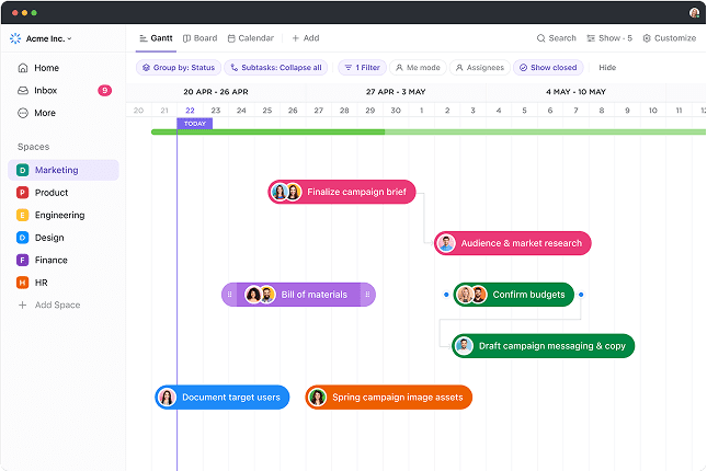 While ClickUp offers beautiful Gantt views, task dependencies, and workload management, it does not yet provide: