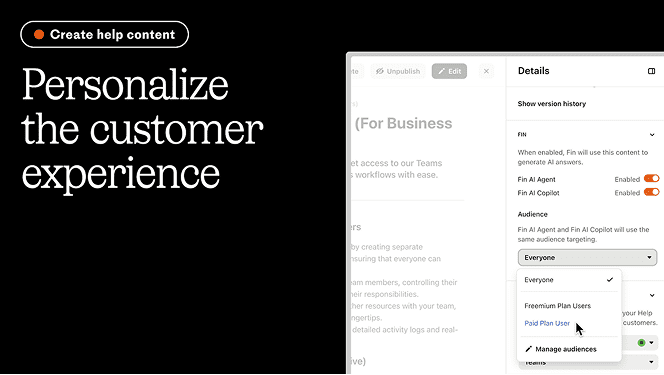 - Fin also respects Help Center visibility rules and can further refine responses based on custom audiences for any content type.