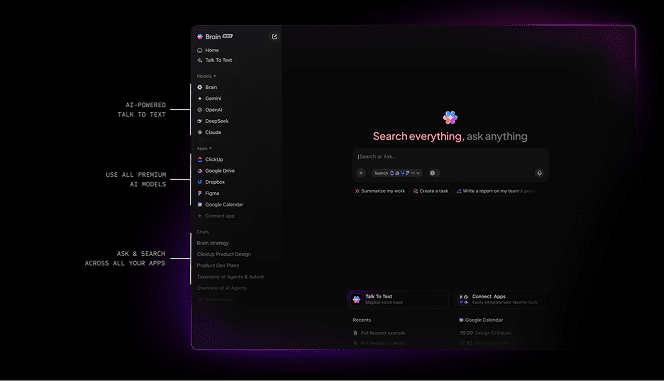 Brain MAX is an AI desktop companion for Windows and macOS (macOS 13+), designed to unify your work across ClickUp, the web, and apps like Google Drive, Figma, GitHub, and SharePoint. It leverages leading AI engines including ClickUp Brain, ChatGPT (GPT‑4.1), Claude (Sonnet 4, Opus 4), and Gemini (2.5 Pro, 2.5 Flash) to help you find, create, and act on information faster.