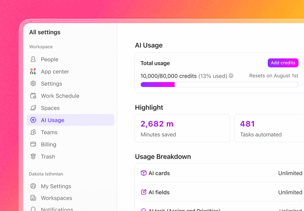 ClickUp now gives a transparent, detailed breakdown of AI credit usage, plus easy options to purchase more, add overage protection, or adjust monthly allocation.