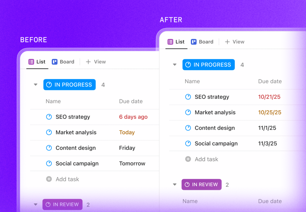 Until now, ClickUp relied mainly on relative dates, showing labels like Today, Yesterday, or Tomorrow. Convenient for internal work, but not so great when sharing deadlines externally.