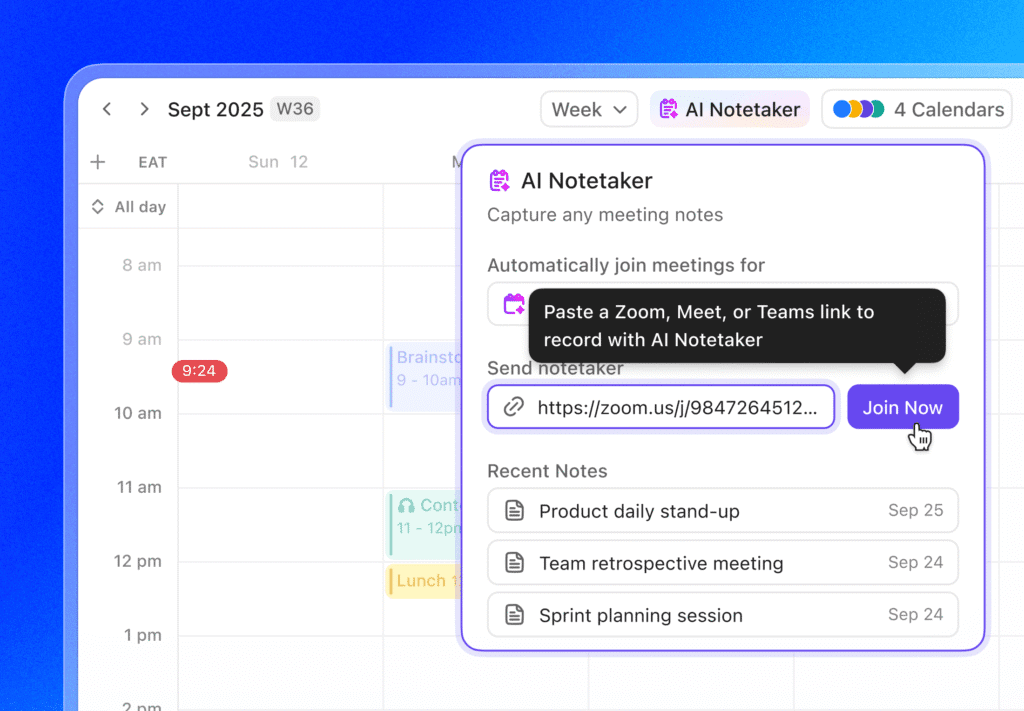 Just paste the meeting URL (Zoom, Google Meet, Teams) in the Notetaker window and ClickUp joins automatically.