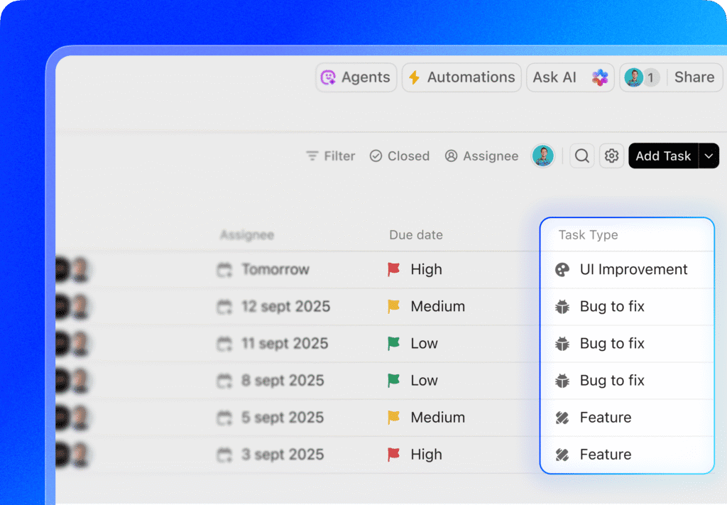 - Let ClickUp AI auto-suggest task types to reduce manual work